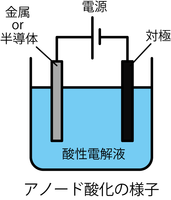 電気化学的な処理であるアノード酸化プロセスにもとづいた新規な物質合成法について研究を行っています。最近は特に、ガリウムやインジウムのアノード酸化プロセスについて積極的に研究を行っています。アノード酸化により形成された物質は、光触媒や水素生成デバイスなどの機能性デバイスへの応用が期待されます。