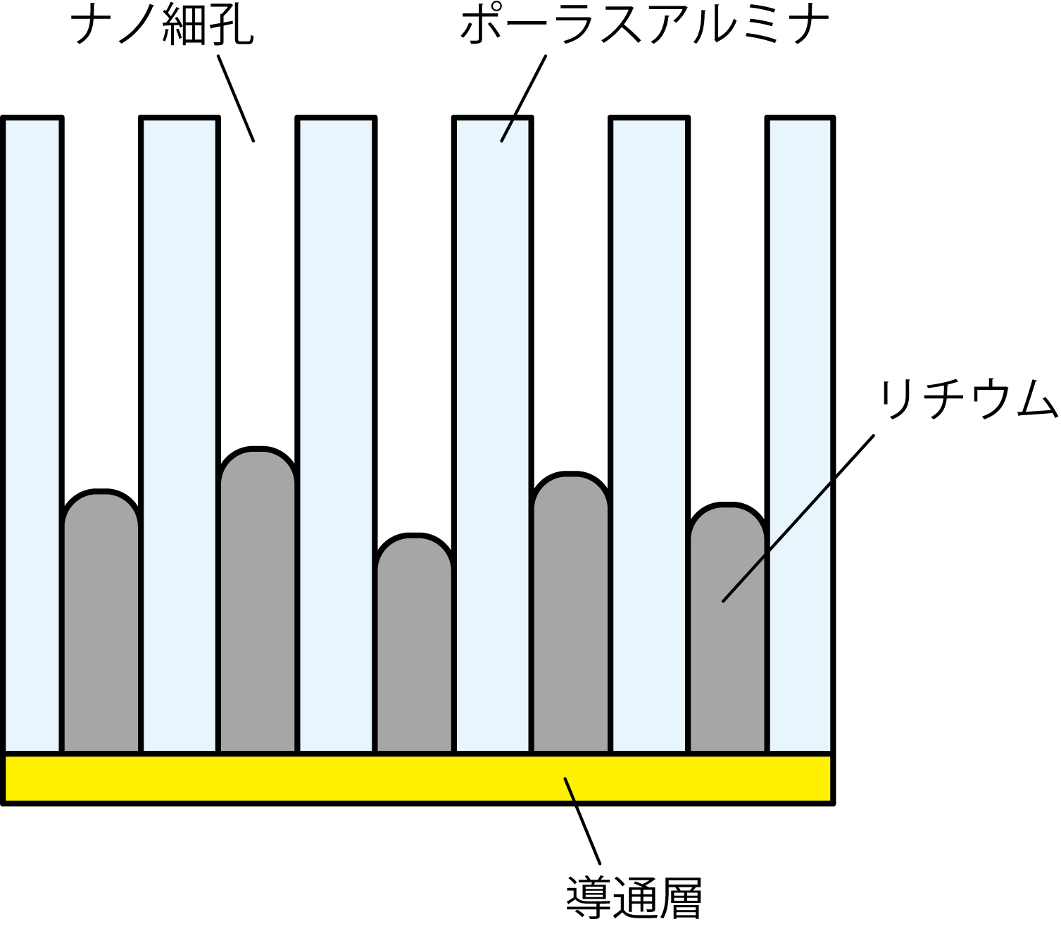 金属リチウム二次電池は,エネルギー密度の高さから次世代電池として注目されています。しかし,充電時のデンドライト形成による電極間ショートが問題となっていました。当研究室では,ポーラスアルミナにもとづき形成された微小空間に金属リチウムを電析(めっき)すると,デンドライト形成が抑制される様子を観察しています。当研究室では,微小空間がデンドライト形成を抑制する現象に着目し,金属リチウム二次電池の開発を行っています。