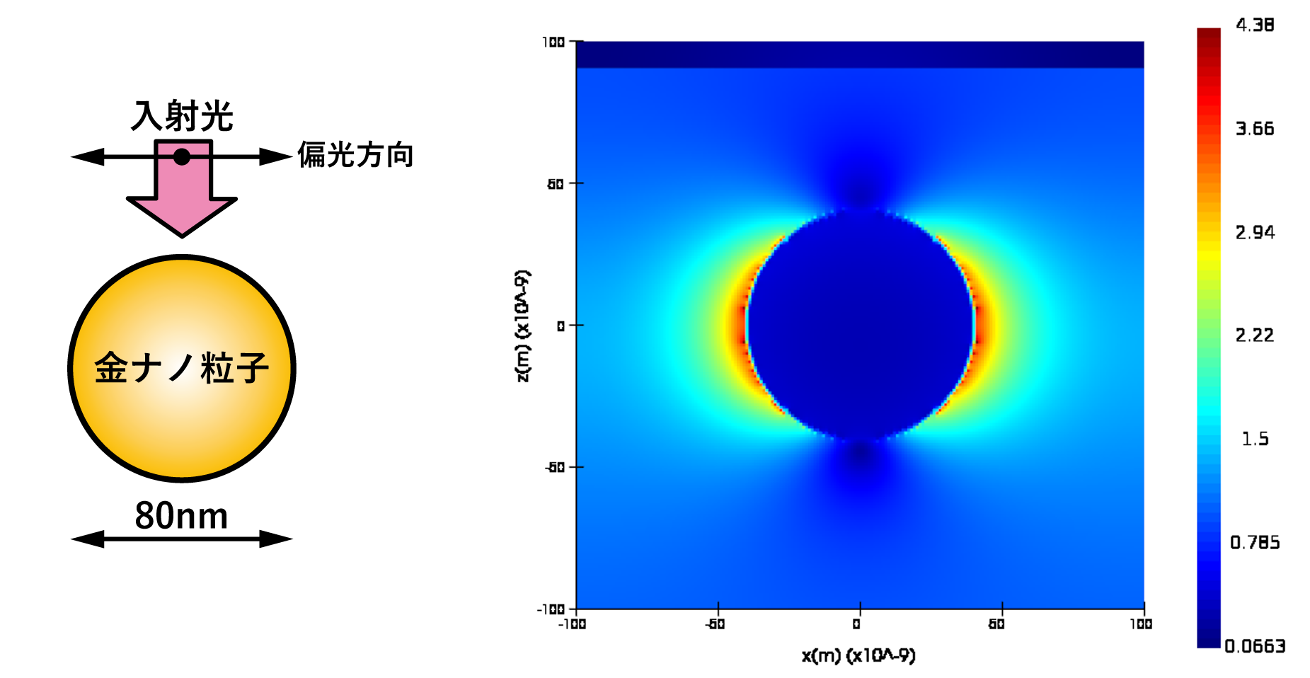 上図(右)には,光電場増強度の計算結果を示しています。右側のカラーバーは電場増強度を示しており,赤色は増強度は高く,青色は増強度が低いことを表しています。計算結果より,金ナノ粒子の左右の部分が赤くなっており,光電場増強場の形成が見られます。また増強度は,金ナノ粒子の表面付近で最も高く,ナノ粒子から離れるに従い低くなっています。増強度は,最も高い場所で,約4倍とわかります。