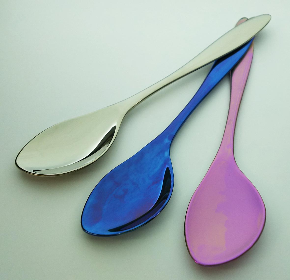 チタン製スプーンにアノード酸化を施すと、カラフルに着色されたスプーンが作製できます。