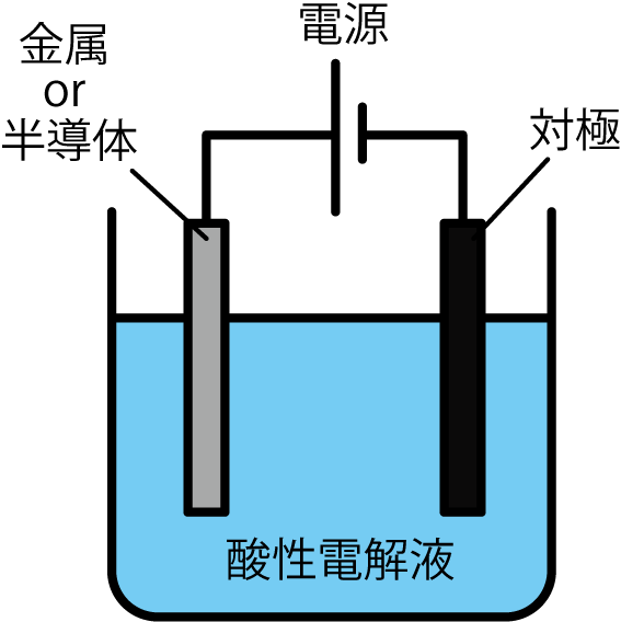 下図に示すように、金属や半導体材料を酸性水溶液(硫酸水溶液など)に浸漬し対極との間に電圧を印加すると、金属や半導体の表面には微細な細孔をもつ酸化物層が形成されます。この処理はアノード酸化(陽極酸化)と呼ばれています。アノード酸化は、古くから防食技術として広く用いられきました。現在でも、アルミサッシの表面処理などに用いられています。当研究室では、特に、アルミニウムをアノード酸化することで得られる「アノード酸化ポーラスアルミナ」が有する特異的な幾何学形状に着目し、アノード酸化ポーラスアルミナを出発材料とした微細構造の形成手法について研究を行っています。また、アルミニウム以外の素材(チタン,ガリウムなど)のアノード酸化プロセス、および、エネルギー変換デバイスへの応用に関しても研究を行っています。